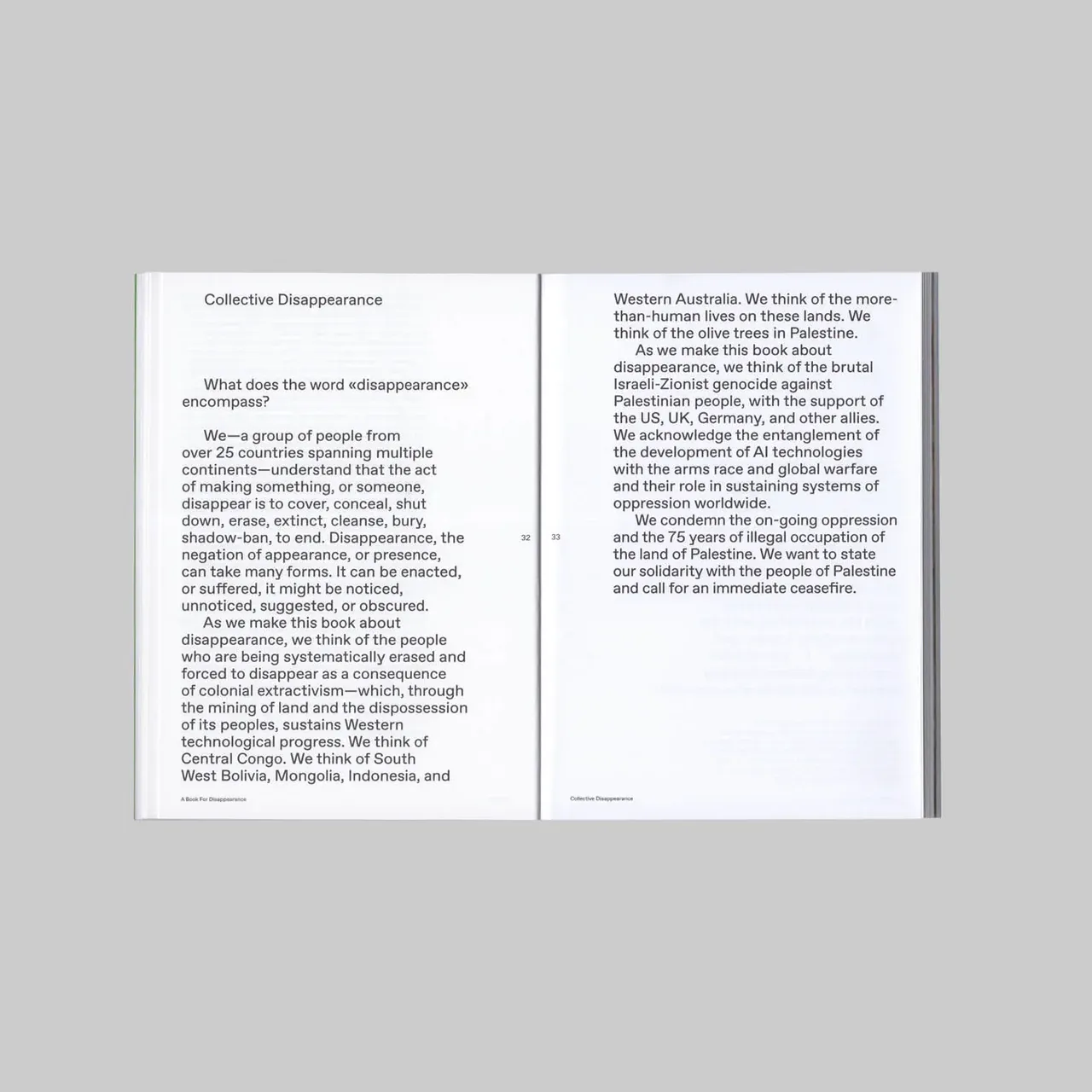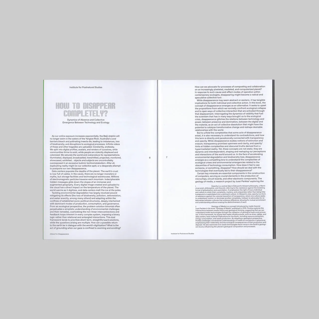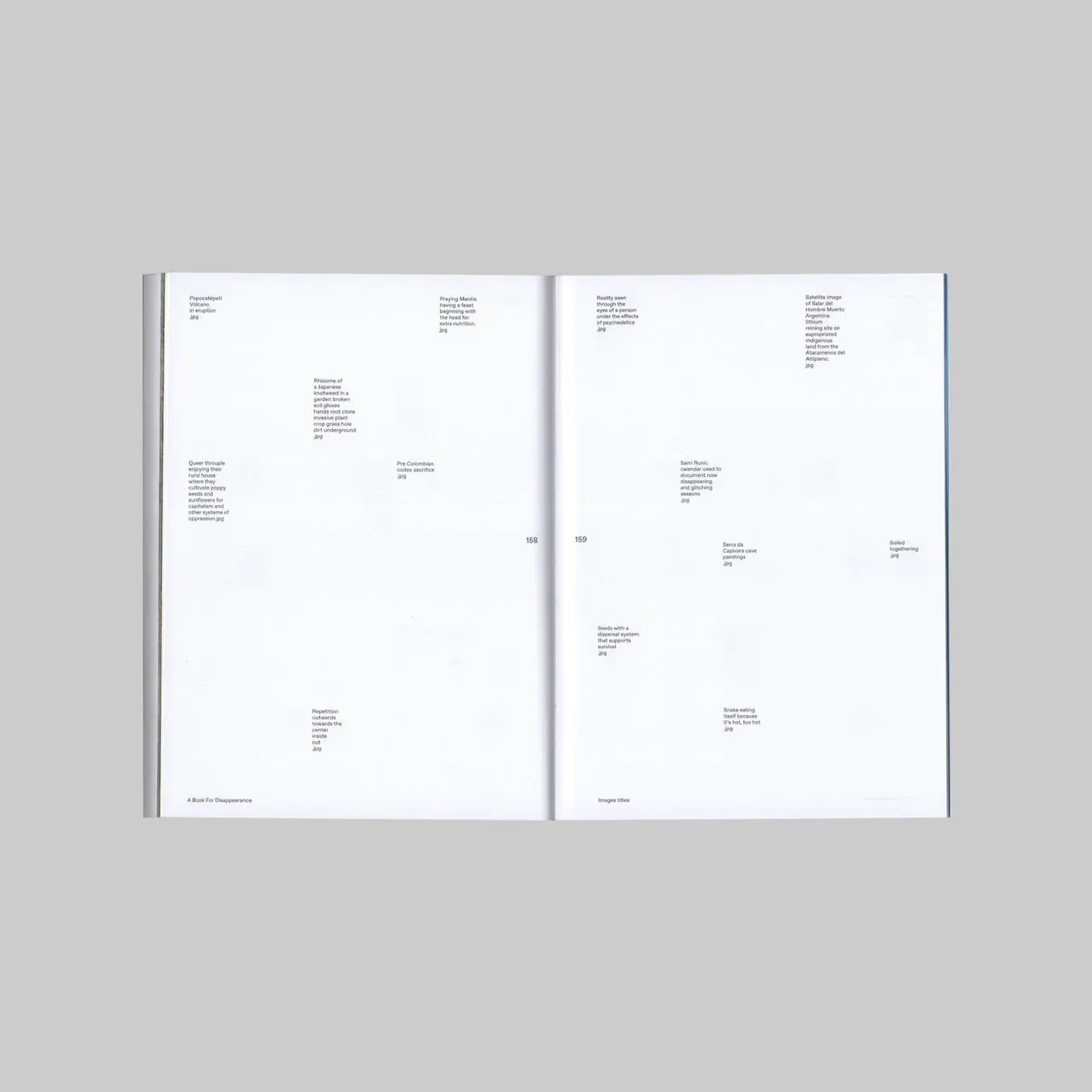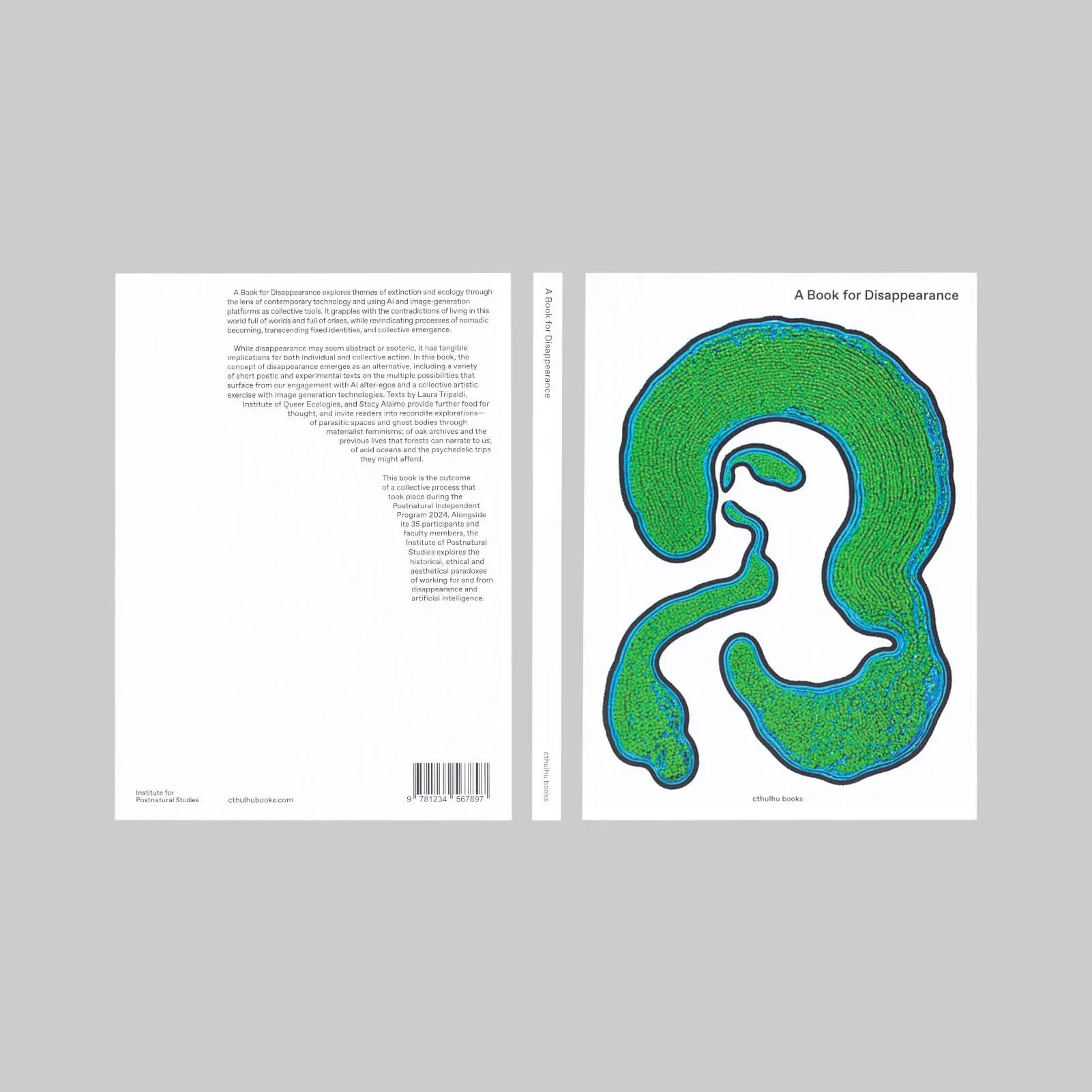 A Book for Disappearance explores themes of extinction and ecology through the lens of contemporary technology and using AI and image-generation platforms as collective tools. It grapples with the contradictions of living in this world full of worlds and full of crises, while revindicating processes of nomadic becoming, transcending fixed identities, and collective emergence. Texts by Laura Tripaldi, Institute of Queer Ecologies, and Stacy Alaimo provide further food for thought, and invite readers into recondite explorations—of parasitic spaces and ghost bodies through materialist feminisms; of oak archives and the previous lives that forests can narrate to us; of acid oceans and the psychedelic trips they might afford.