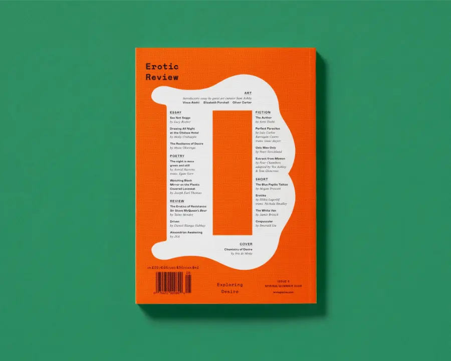 First published in 1997 as a bimonthly magazine, the Erotic Review relaunched in 2024 as an art and literary platform that explores desire. Edited by Lucy Roeber and Saskia Vogel, designed & art directed by Studio Frith, the Erotic Review publishes stories, poetry and essays by leading writers and each limited edition magazine is curated by a different art editor.