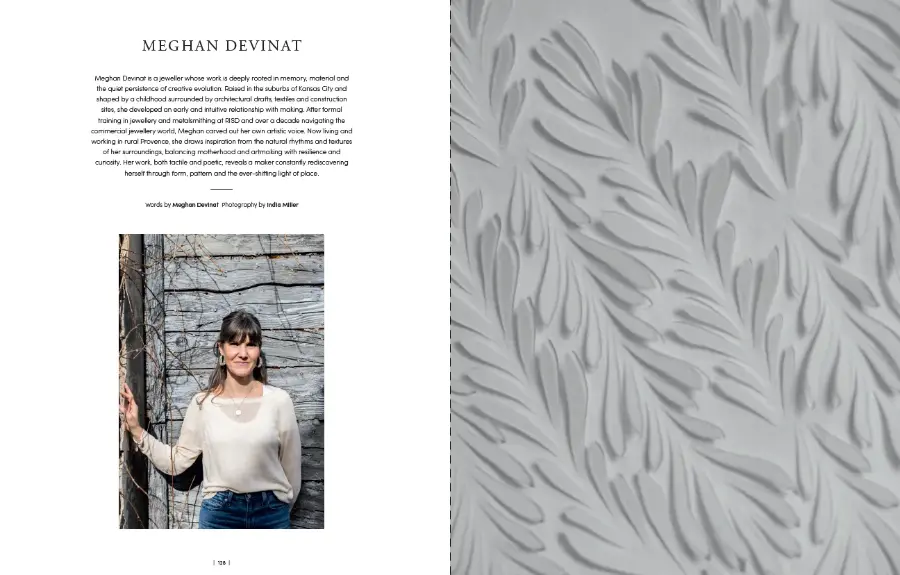 Meghan Devinat is a jeweller whose work is deeply rooted in memory, material and the quiet persistence of creative evolution. Now living and working in rural Provence, she draws inspiration from the natural rhythms and textures of her surroundings, balancing motherhood and artmaking with resilience and curiosity.