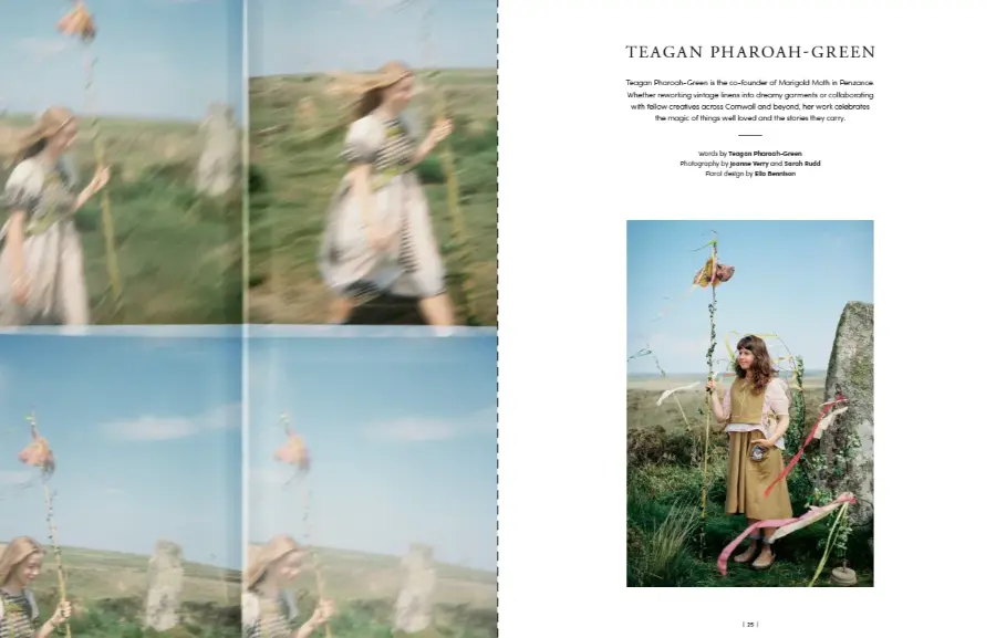 Teagan Pharoah-Green is the co-founder of Marigold Moth in Penzance. Whether reworking vintage linens into dreamy garments or collaborating with fellow creatives across Cornwall and beyond, her work celebrates the magic of things well loved and the stories they carry.