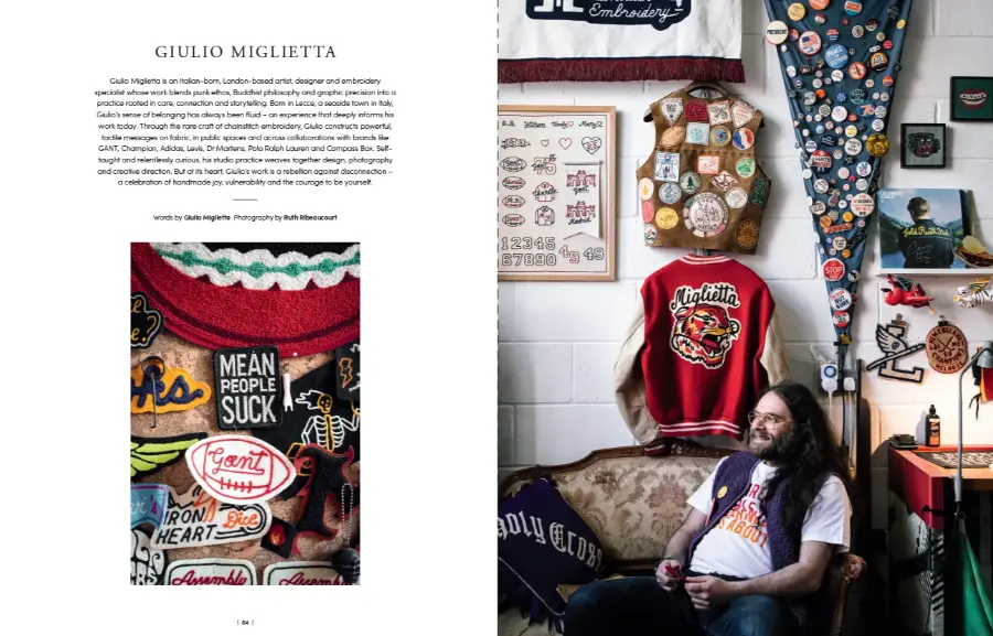 Giulio Miglietta is an Italian-born, London-based artist, designer and embroidery specialist whose work blends punk ethos, Buddhist philosophy and graphic precision into a practice rooted in care, connection and storytelling.