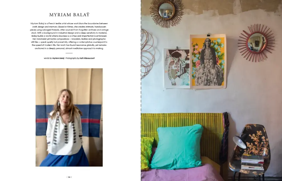 Myriam Balaÿ is a French textile artist whose work blurs the boundaries between craft and design. Based in Nîmes, she creates intimate, handwoven pieces using salvaged threads, often sourced from forgotten archives and vintage stock.