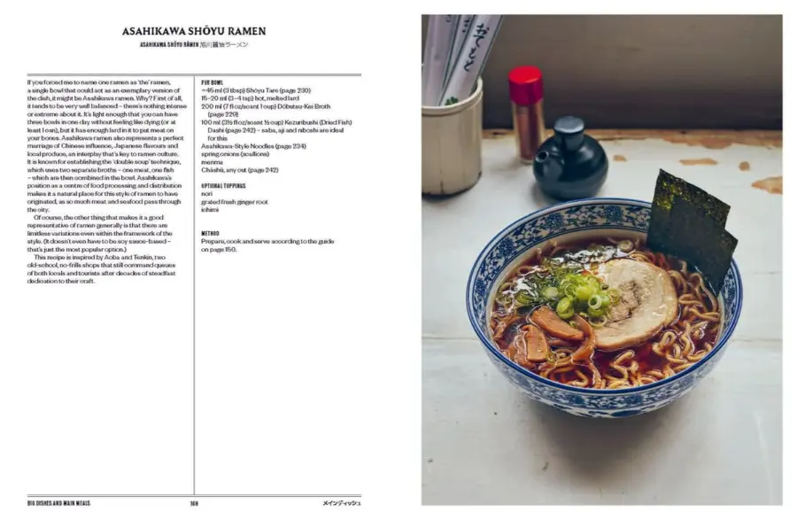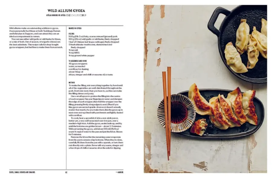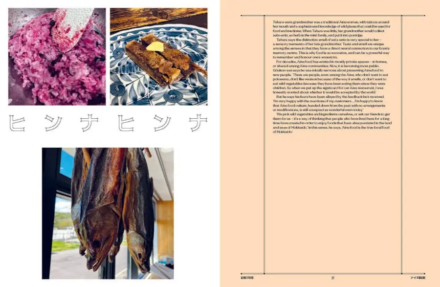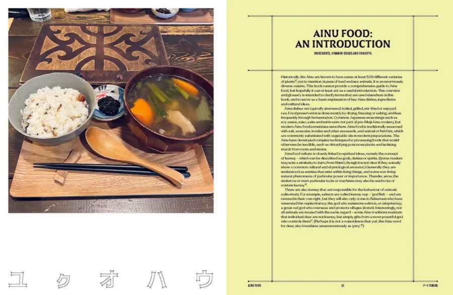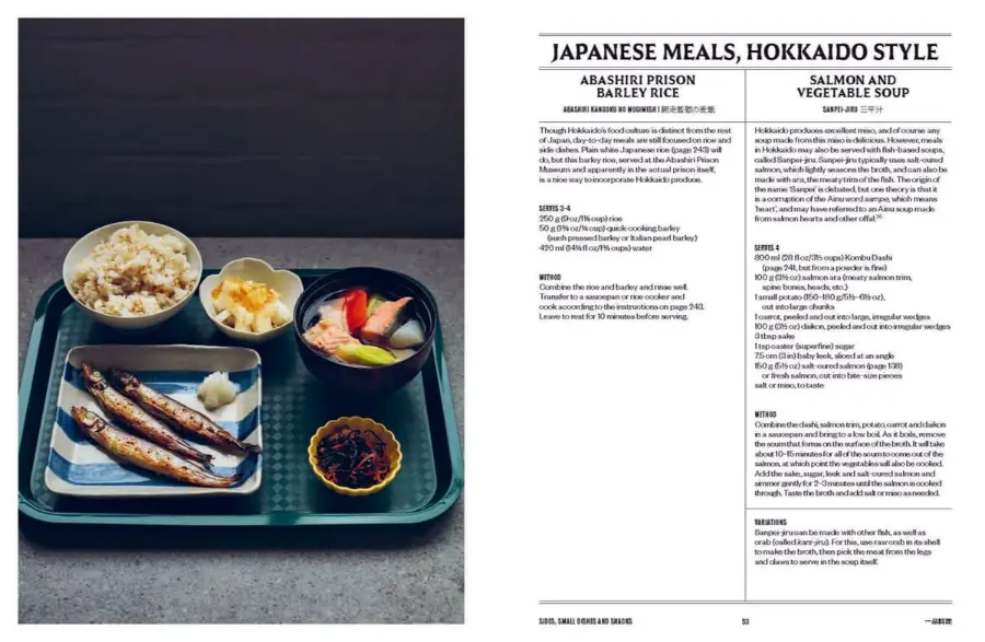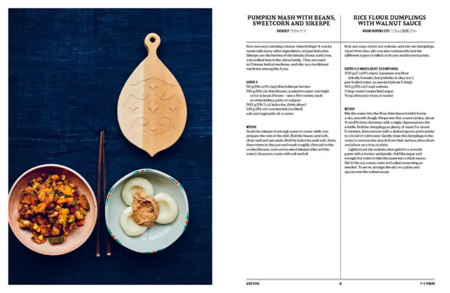 The recipes mostly fall into two categories: traditional, regional dishes and homages to specific dishes. There are also four Ainu recipes, which have been contributed by an Ainu chef, Hiroaki Kon.