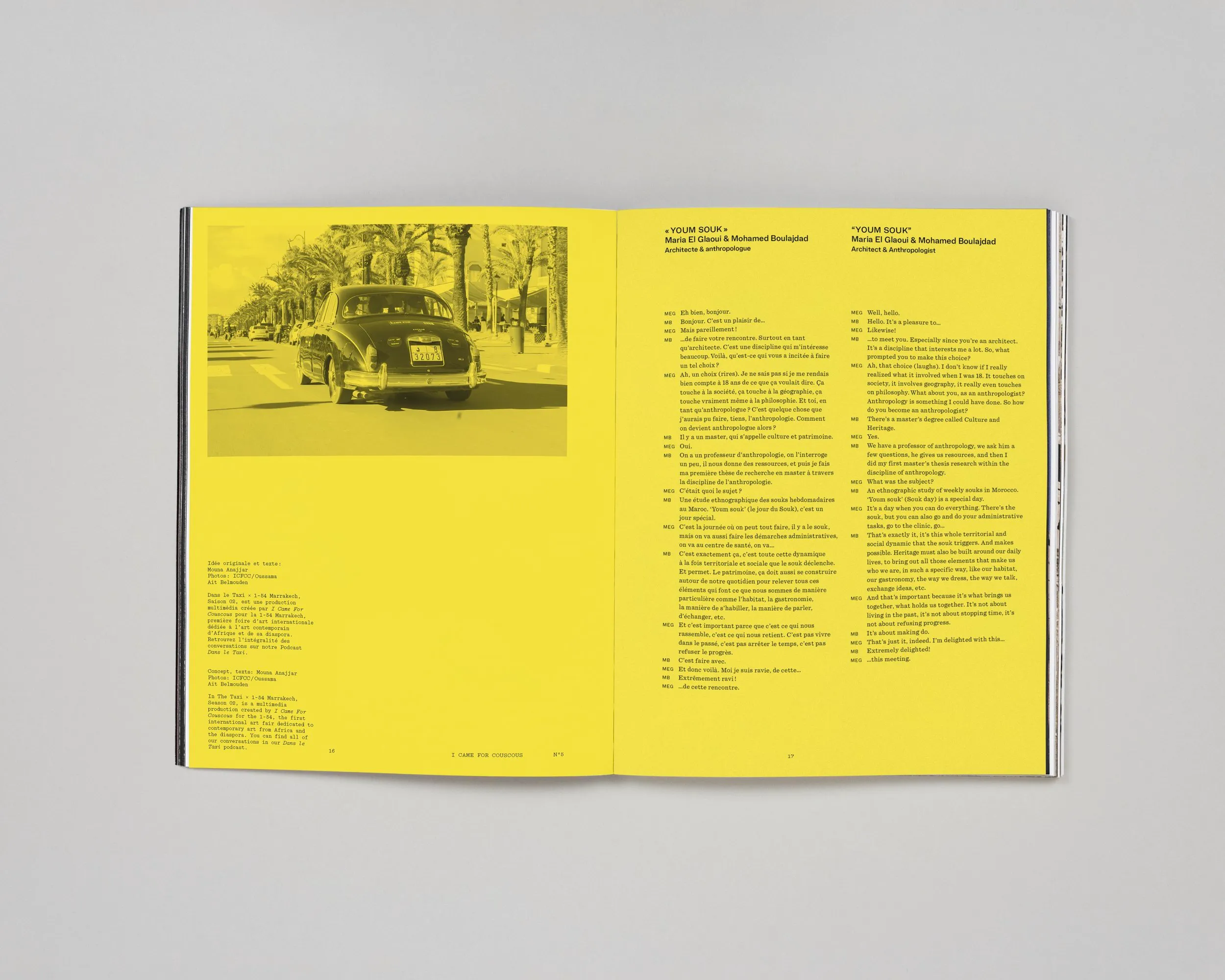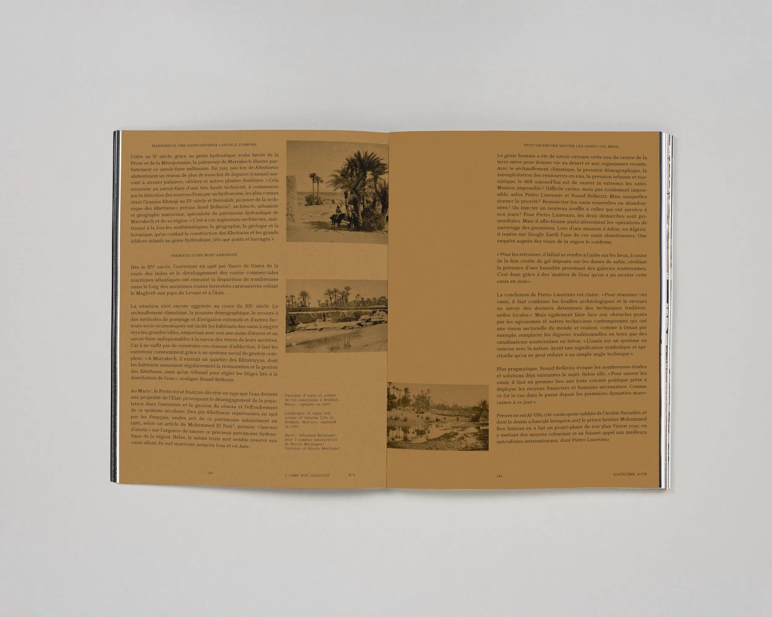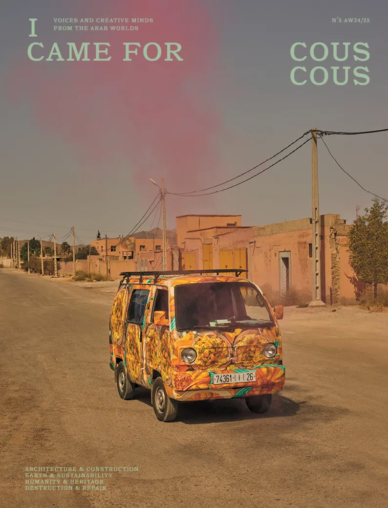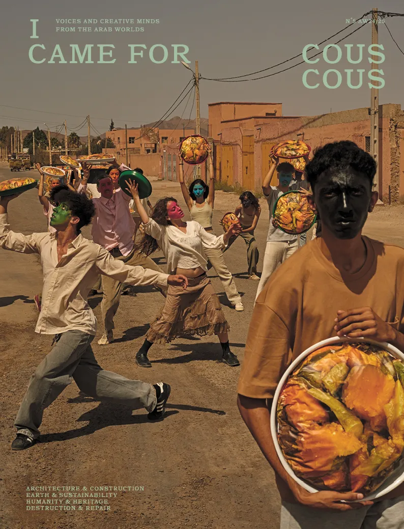 In the second act, Azim Haidaryan plunges us into a seemingly troubled landscape in his “Couscous Chaos” series. In this setting, the beloved dish of couscous inspires a dance of unity and solidarity and symbolizes a peaceful statement against the turbulence of today’s world. Then, in Aït Othmane, a village in Morocco devastated by the recent earthquake, Myriam and Laurent from Archibionic unveil their temporary housing solution, the result of a community-minded mobilization operation featuring a construction kit presented exclusively in this issue. Finally, Khaled Osman regales us with a dystopian short story in which a man returns to Cairo after years of exile and discovers a futuristic city where modernity exists alongside excess and isolation.
