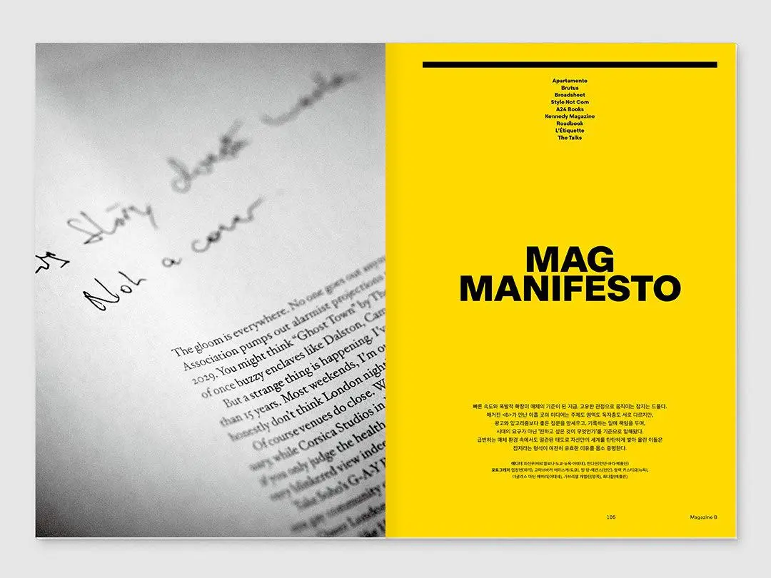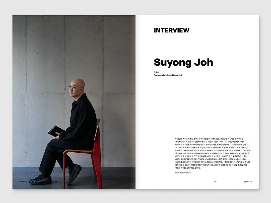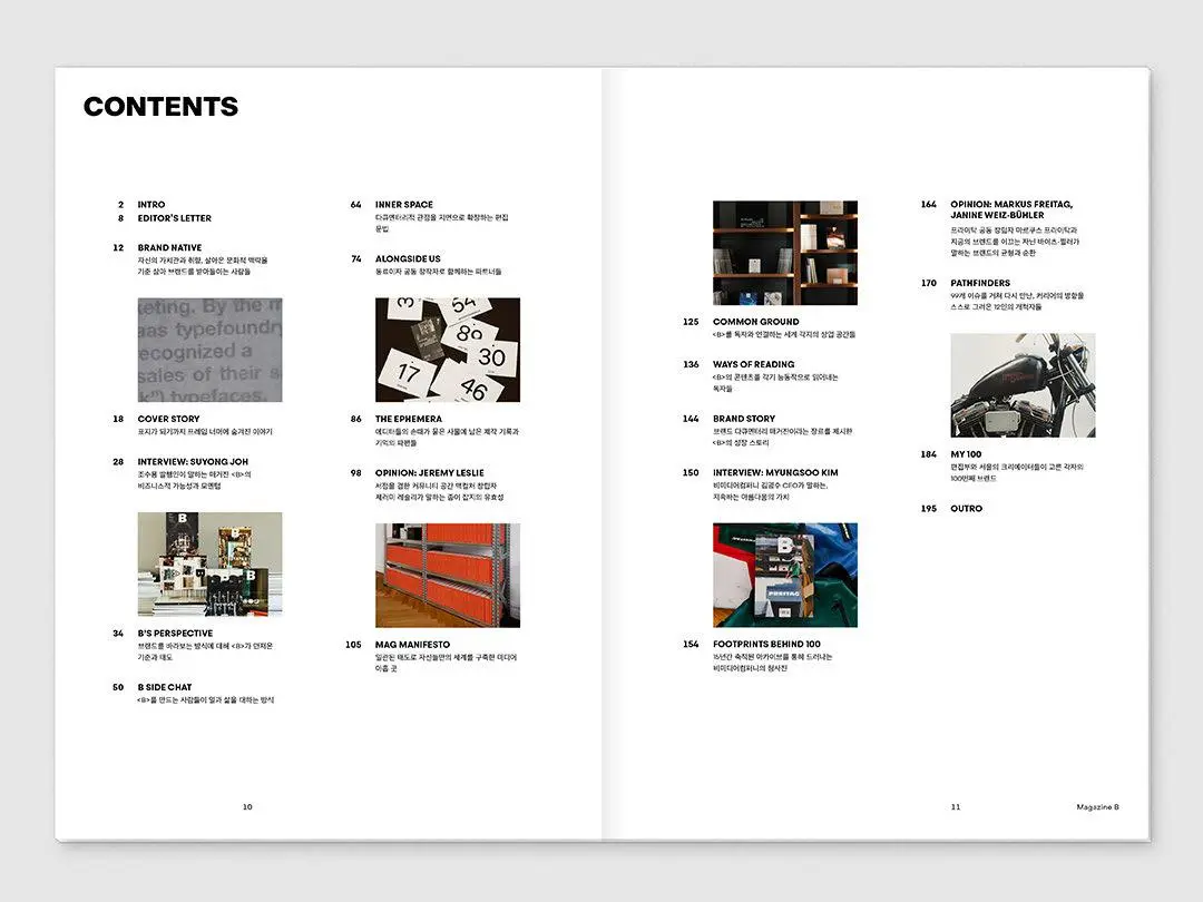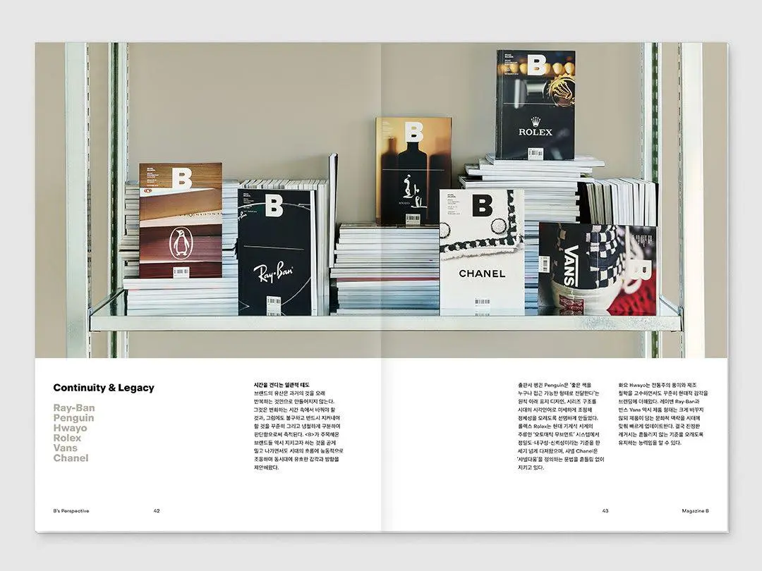 Magazine B, founded in Seoul, South Korea, in 2011 by Suyong Joh, is a documentary magazine featuring well-balanced brands that are selected based on four criteria: philosophy, price, aesthetic, and practicality. In an era when most magazines push breaking news and hot trends, B offers something fresh: a regularly published series in book form that examines brands as subjects with unique narratives and structures. Running ad-free from issue 1 to 100, the magazine has been praised for upholding the pursuit of objectivity and maintaining its independent perspective. Seen in the global creative scene as a brand guide and valuable collectible, B is expanding its experiential touchpoints with podcasts, video content, and physical stores, gearing up for its next chapter as a media brand that presents a full spectrum of brand content.