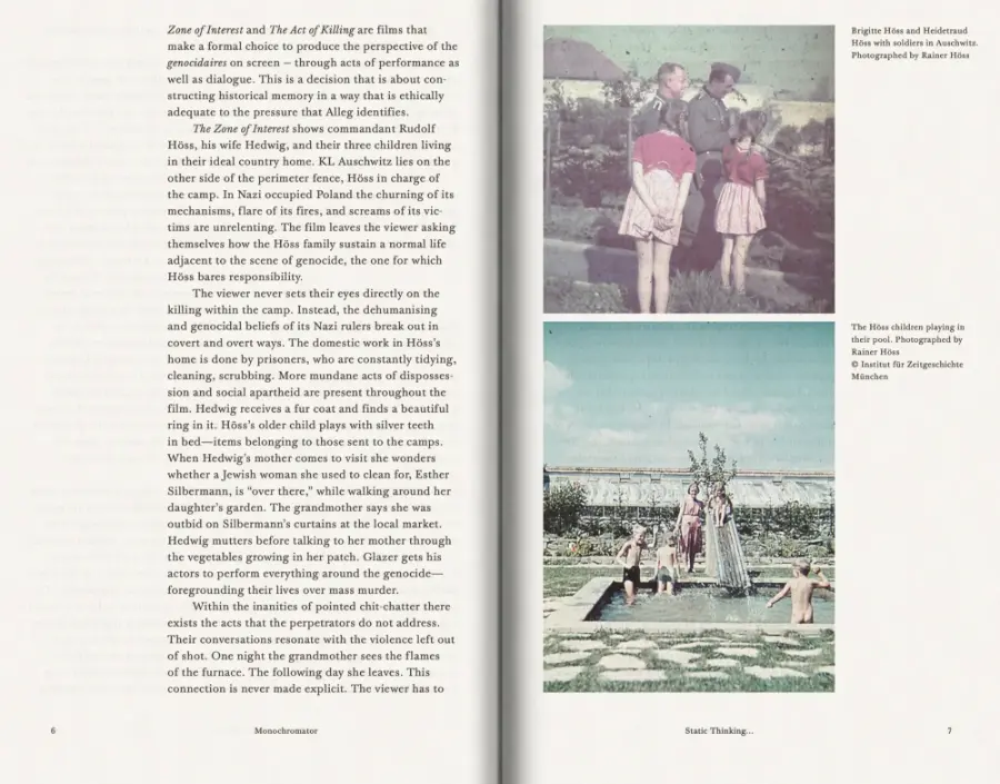MONOCHROMATOR 002 deconstructs Jonathan Glazer’s 2023 film The Zone of Interest and Joshua Oppenheimer’s 2012 documentary The Act of Killing under the manifesto of We Refuse to Be Afraid.