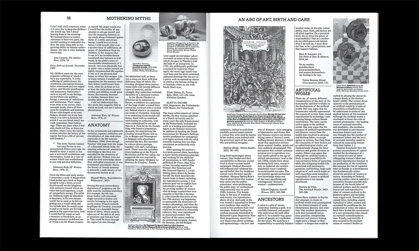 Mothering Myths unravels these clichés, stigmas and myths, through the lens of art, and a transhistorical and intersectional perspective, while being very playful and open to many interpretations. It breaks through the perspective of the individual mother figure and makes space for collectivity, different forms of ‘mothering’ and political questions surrounding self-determination. Mothering Myths presents the emancipatory nature of the artist-mother, the voluntarily childless woman, the non-female mother and the ‘raven mother’, through concepts such as kinship, revolutionary parenting, womb consciousness and reproductive justice.