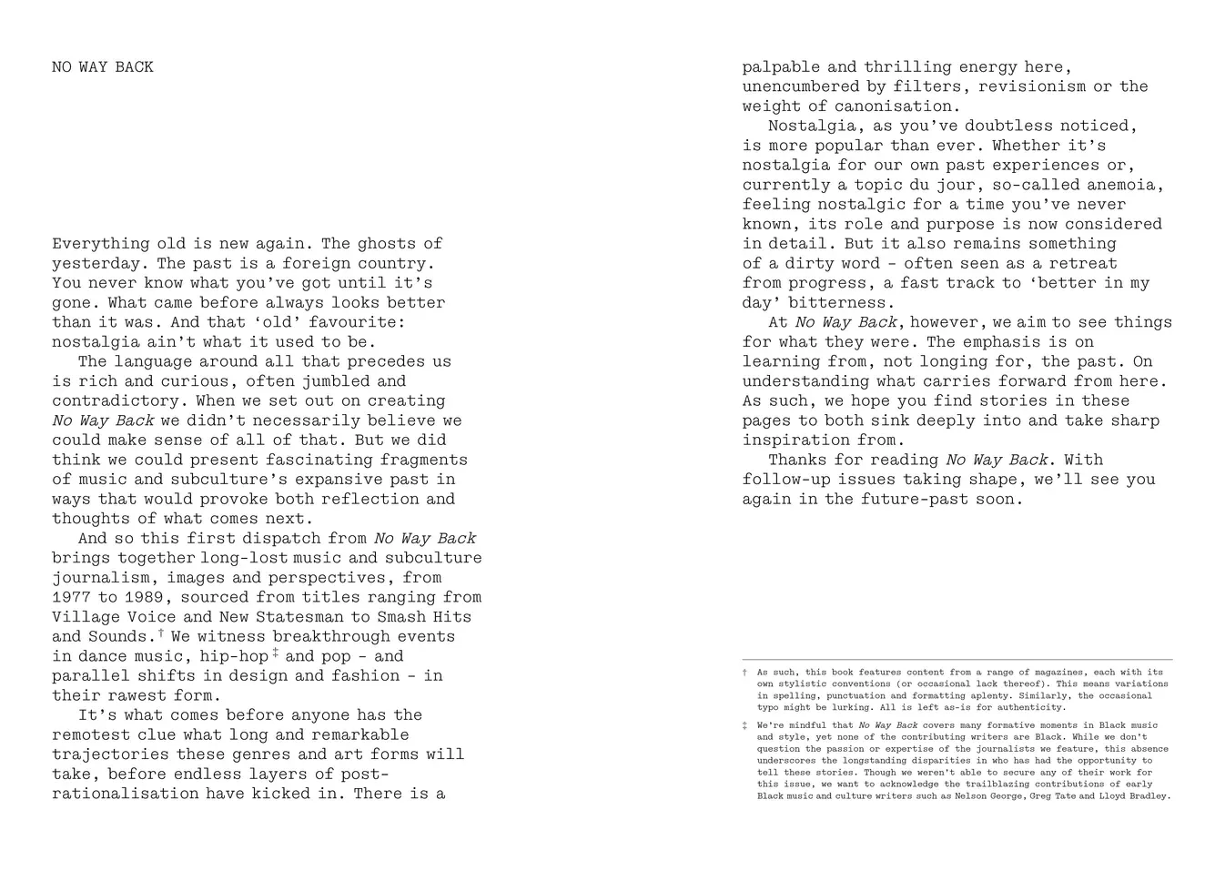 No Way Back features journalism that lets us read about culture in its rawest form. Breakthrough events in dance music, hip-hop and pop — and parallel shifts in art, design and fashion. Inspirational ground-level creativity and enterprise that set the scene(s) for subsequent decades.