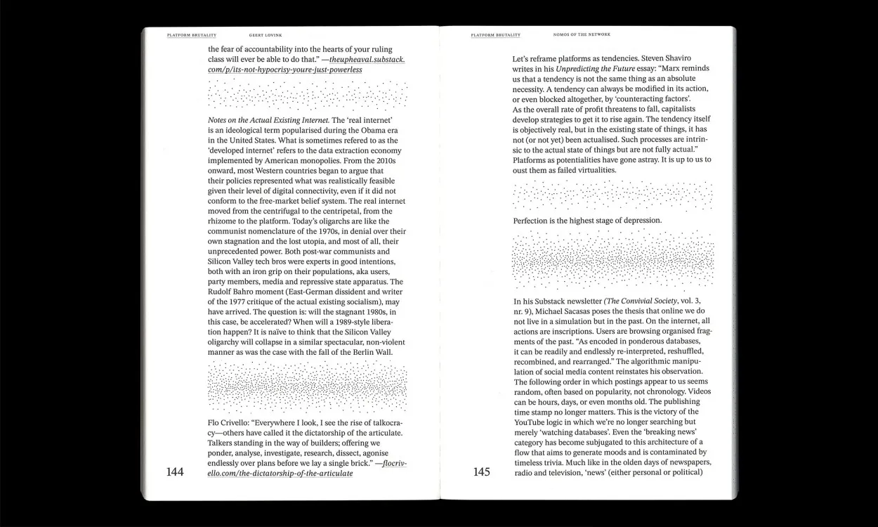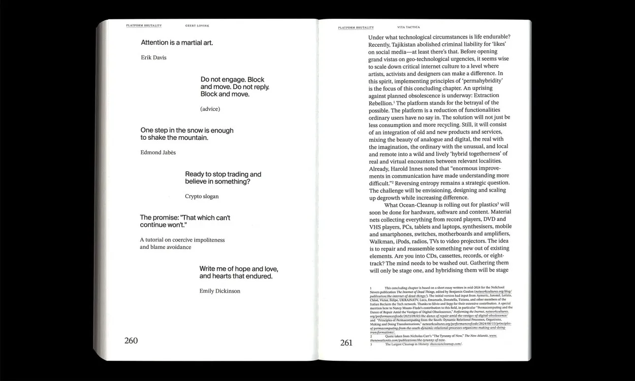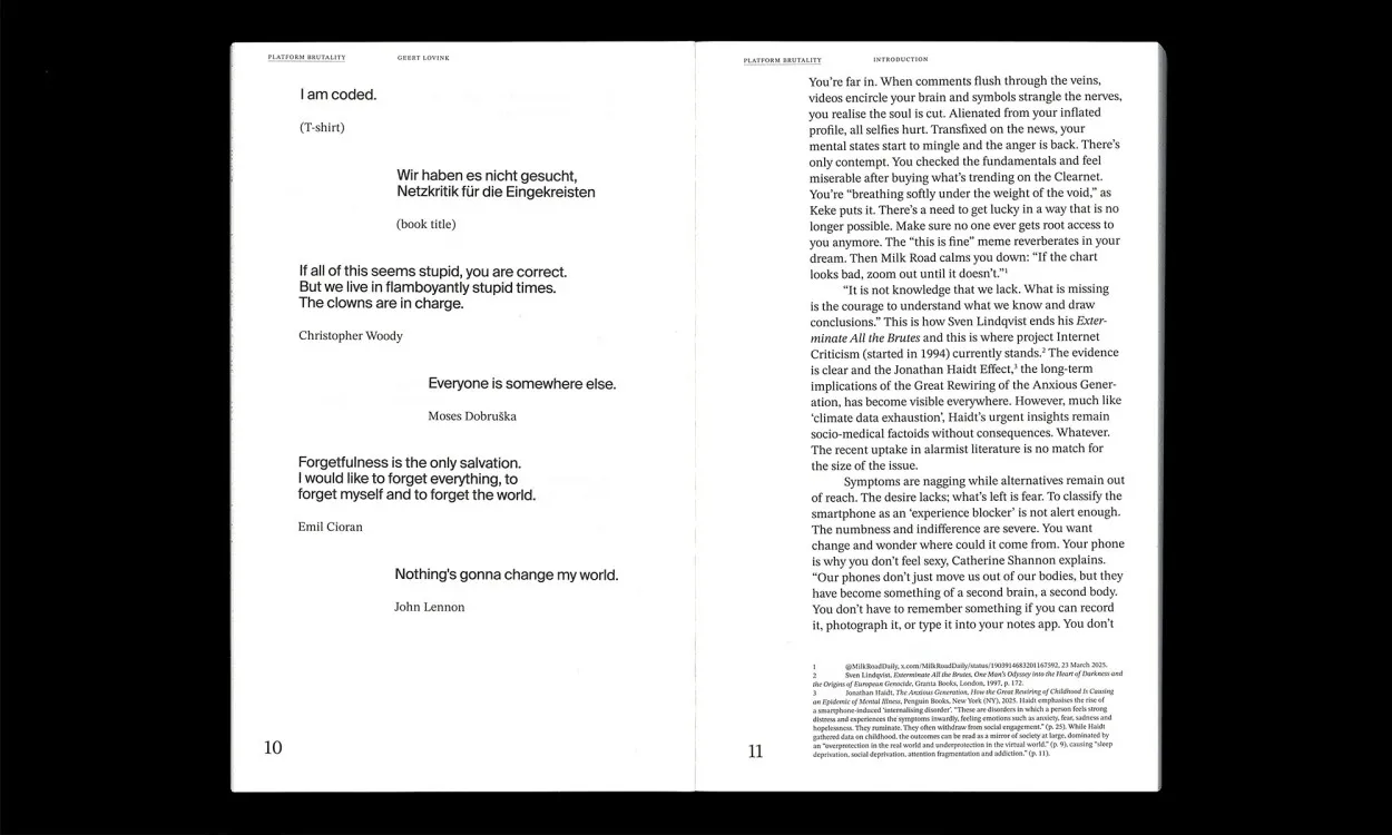 Platform Brutality not just offers critical analyses but also dives into alternatives. Topics range from the violent turn of the internet and techno-feudalism debates, to loneliness on social media, radical data critique, mythologies that surround the smart phone, dreaming in the computer age, offline romanticism to question how to leave the platforms, bring back social networks and design a new balance between analogue and digital.